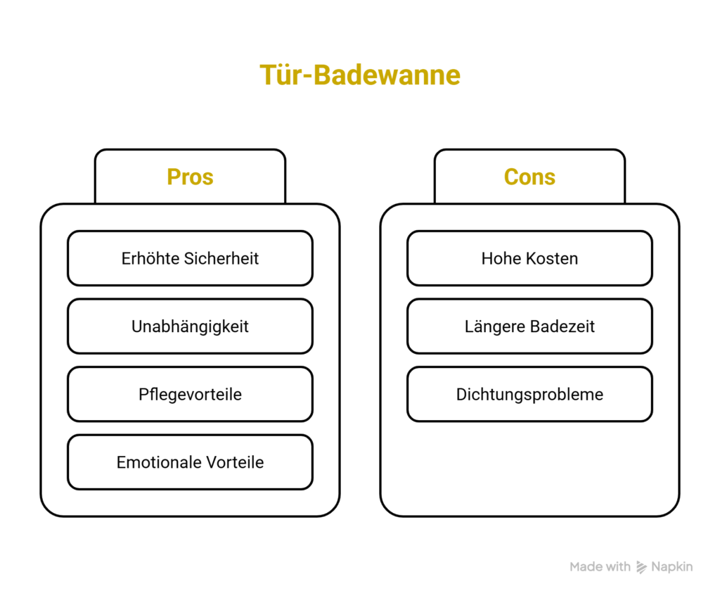 Für mich persönlich wiegen die Vorteile deutlich schwerer als die Nachteile. Der wichtigste Vorteil ist die enorme Steigerung der Sicherheit: Durch den niedrigen, breiten Einstieg und den stabilen Sitz sinkt das Sturzrisiko dramatisch. Wer unter Schwindel, Gelenkbeschwerden oder Kreislaufproblemen leidet, spürt sofort, wie viel entspannter sich das Baden anfühlt. Ein weiterer großer Vorteil ist die Unabhängigkeit: Man kann sein Bad selbstbestimmt genießen, ohne ständig Angst vor einem Sturz zu haben. Auch für pflegende Angehörige ergibt sich ein enormer praktischer Vorteil – das Unterstützen oder Waschen ist biomechanisch deutlich einfacher und rückenschonender. Zusätzlich bleibt das Vollbad als entspannende Aktivität erhalten, was gerade im höheren Alter oder bei chronischen Erkrankungen emotional wichtig ist.
