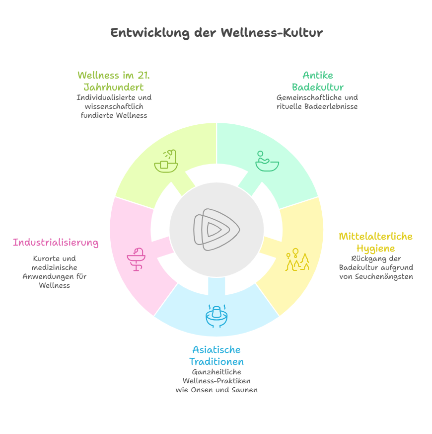 Infografik zur Entwicklung der Wellness Kultur von der Antike bis ins 21. Jahrhundert